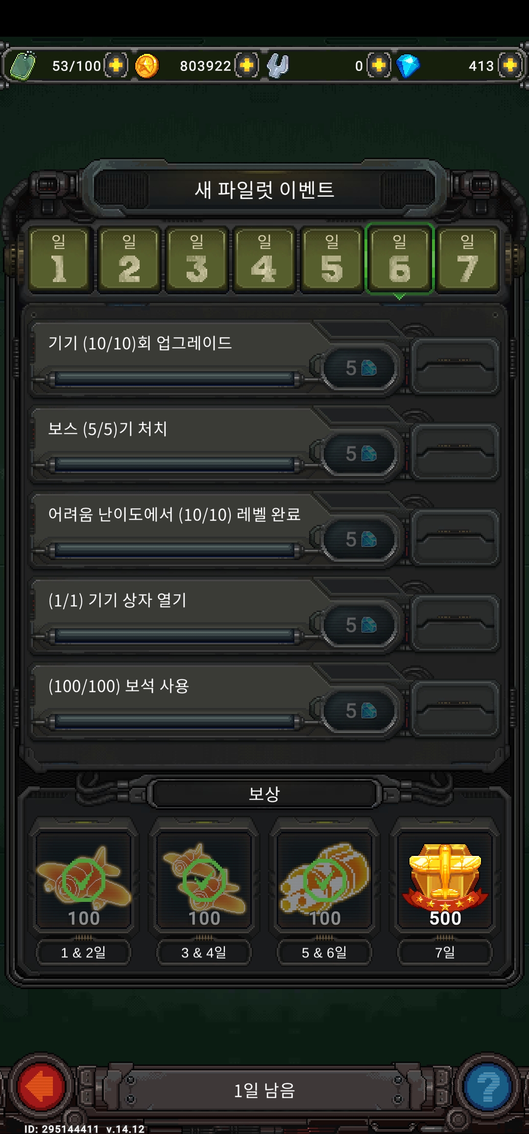 대부분의 게임이 그렇듯 1945 공군에도 신규 유저를 위한 이벤트가 있다. 그런데 문제는 무과금으로는!!!! 깨기 힘들다. 7일 동안 하루에 5개씩, 총 35개의 퀘스트가 열리는데 마지막 7일차 퀘스트는 이 글을 보고!!!! 퀘스트를 미리 알고 있어도!!!! 무과금으로 절대절대 깰 수 없을 거라 확신한다. 따라서 우리는 과감히 7일차 퀘스트를 버리도록 하자. 그래도 괜찮다.